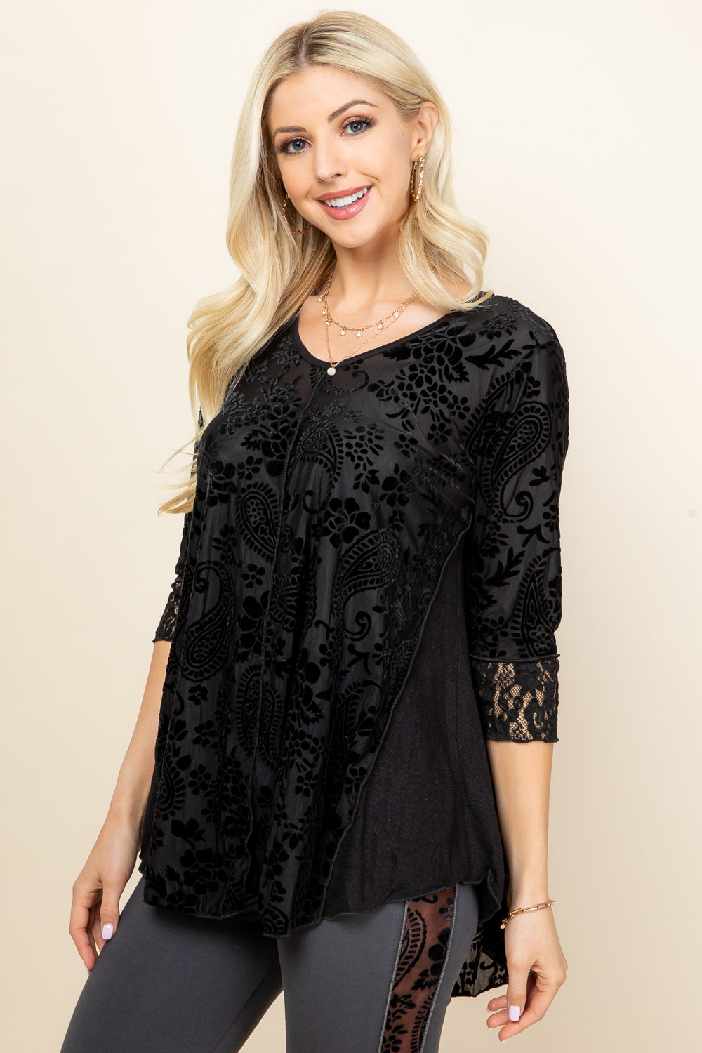 Black Velvet Patchwork Tunic Top – Boho Paisley 3/4 Sleeve Blouse | Made in USA